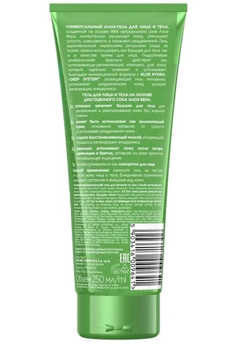 Aloe-gel universal fabricat în baza a 99% suc natural de Aloe Vera, hidratează momentan și hrănește pielea, reduce iritațiile , inflamațiile, roșeața. Produs conform rețetelor și tradițiilor coreene, gelul poate fi folosit în calitate de balsam de corp sau creamă de față. Formula universală a hidrogelului acționează ca o compresa calmantă și hidratantă pentru piele, care este ideală pentru împrospătarea și calmarea pielii.
